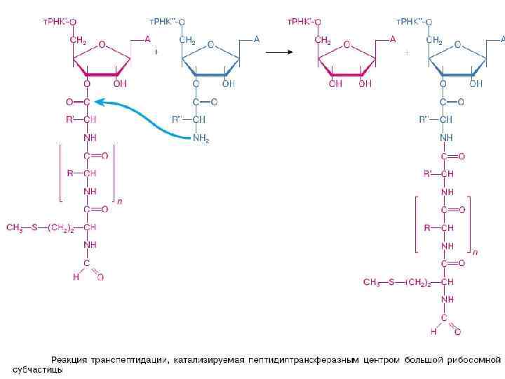 Основные реакции трансляции Три последовательные химические реакции приводят к включению (добавлению) аминокислоты в полипептидную цепь строящегося белка: 1) аминокислота + АТФ аминоацил-аденилат + пирофосфат, 2) аминоацил-аденилат + т. РНК' аминоацил-т. РНК' + АМФ, 3) пептидил(n)-т. РНК + аминоацил-т. РНК‘ т. РНК + пептидил(n + 1)-т. РНК'.