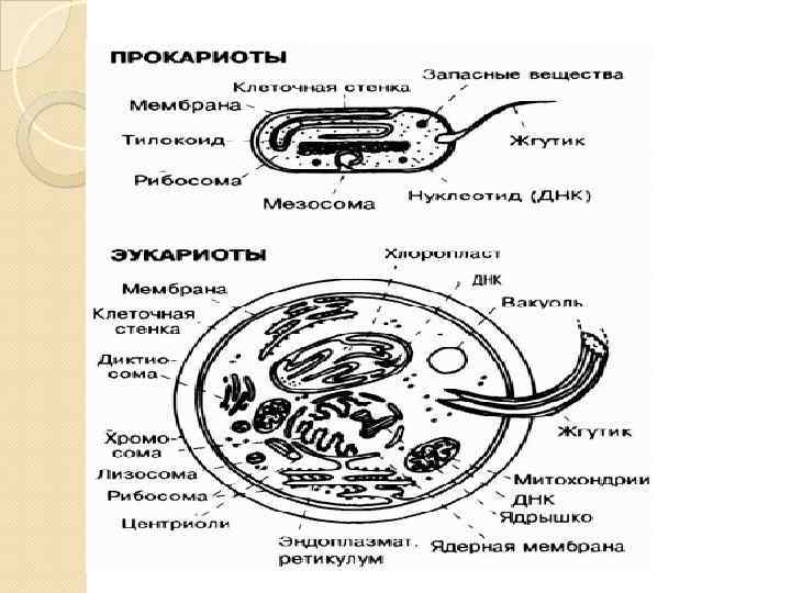 Признак Прокариотная клетка Эукариотная клетка Организация генетического материала нуклеоид (ДНК не отделена от цитоплазмы мембраной), ядро (ДНК отделена от цитоплазмы ядерной оболочкой), в нуклеоиде и плазмидах, не ограниченных элементарной мембраной в ядре и некоторых органеллах отсутствуют имеются 70 S-типа 80 S-типа Цитоплазматические органеллы отсутствуют имеются Движение цитоплазмы отсутствует часто обнаруживается Локализация ДНК Цитоплазматические органеллы Рибосомы в цитоплазме Клеточная стенка (там, где она имеется) Жгутики в большинстве случаев содержит пептидогликан нить жгутика построена из белковых субъединиц, образующих спираль пептидогликан отсутствует каждый жгутик содержит набор микротрубочек, собранны в группы: 2· 9 -2