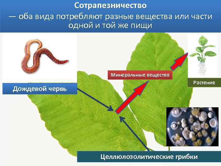 Сотрапезничество — оба вида потребляют разные вещества или части одной и той же пищи Минеральные вещества Дождевой червь Растение Целлюлозолитические грибки