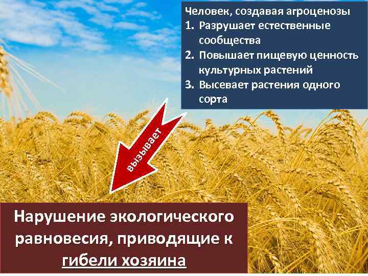 вы зы ва ет Человек, создавая агроценозы 1. Разрушает естественные сообщества 2. Повышает пищевую ценность культурных растений 3. Высевает растения одного сорта Нарушение экологического равновесия, приводящие к гибели хозяина