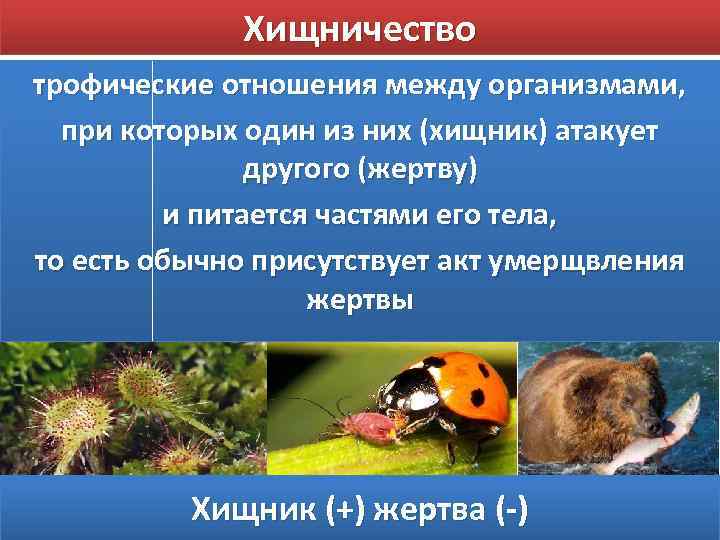 Хищничество трофические отношения между организмами, при которых один из них (хищник) атакует другого (жертву) и питается частями его тела, то есть обычно присутствует акт умерщвления жертвы Хищник (+) жертва (-)