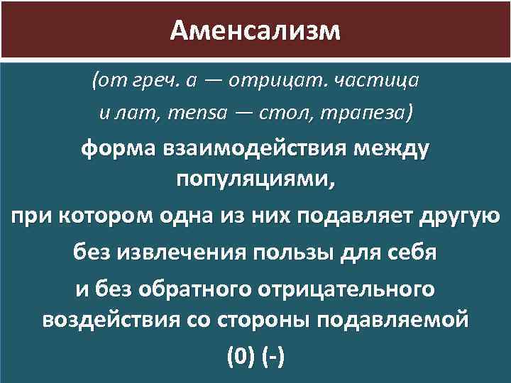 Аменсализм (от греч. а — отрицат. частица и лат, mensa — стол, трапеза) форма взаимодействия между популяциями, при котором одна из них подавляет другую без извлечения пользы для себя и без обратного отрицательного воздействия со стороны подавляемой (0) (-)