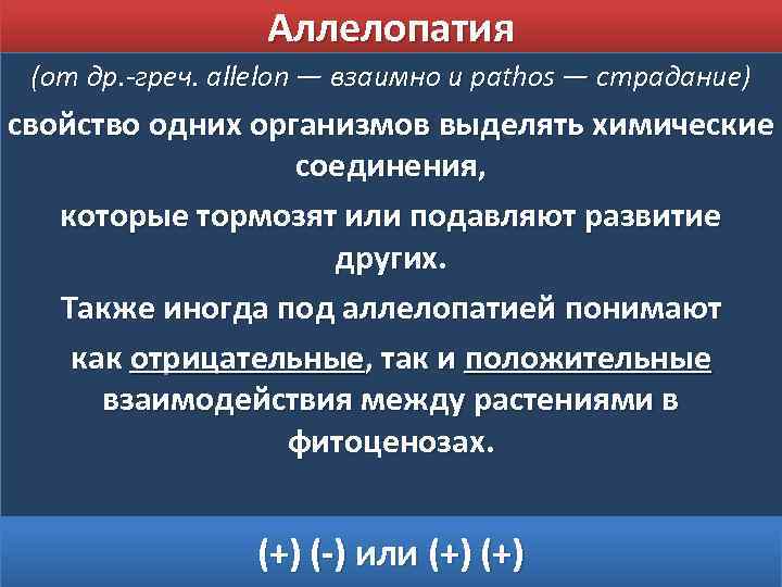 Аллелопатия (от др. -греч. allelon — взаимно и pathos — страдание) свойство одних организмов выделять химические соединения, которые тормозят или подавляют развитие других. Также иногда под аллелопатией понимают как отрицательные, так и положительные взаимодействия между растениями в фитоценозах. (+) (-) или (+)