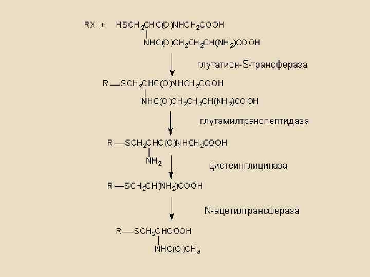 Основные ферменты и метаболиты, участвующие в реакциях конъюгации Тип конъюгации Фермент Метаболит, используемый для конъюгации Активная форма метаболитов Локализация процесса Глутатионовая Глутатионтрансфераза Глутатион (GSH) Цитозоль, гл. ЭПР Глюкуронидная УДФ-глюкуронилтрансфераза Глюкуронат УДФ-глюкуронат Гл. ЭПР Сульфатная Сульфотрансфераза Сульфат Аминокислотная Ацил-Ко. А-синтетаза, ацилтрансфераза Аминокислоты Ацил-Ко. А (АТФ) Митохондрии, цитозоль, ЭПР, лизосомы Метилирование Метилтрансфераза Метил S-аденозилцистеин Цитозоль, ЭПР Ацетилирование Ацетил- трансфераза Ацетил-Ко. А Цитозоль 3'-фосфоаденозин-5'фосфосульфат Цитозоль