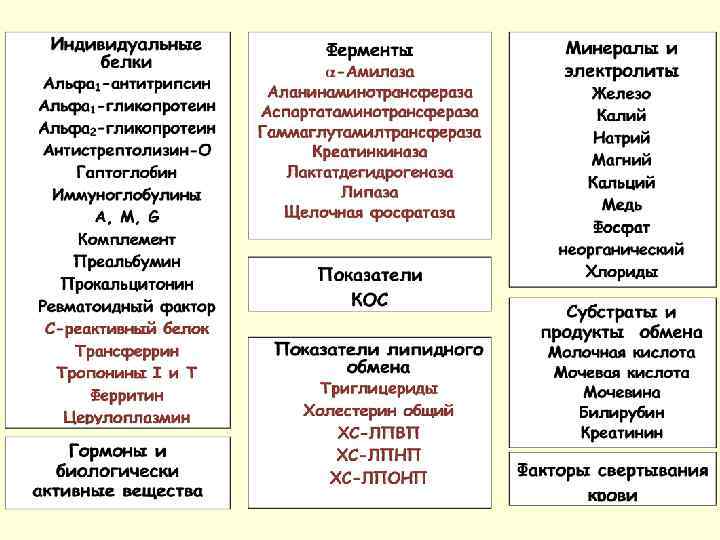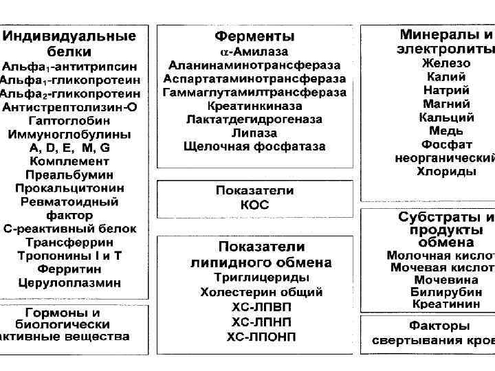 Классификация клинико-химических аналитов: • белки, • липиды, • углеводы; По особенностям структуры: По связи с функцией определенных органов: • Печени, Почек, Сердце, Легкие Функциональной ролью: • гормоны и медиаторы, • параметры кислотно-основного равновесия; По связи с поражением отдельных органов и систем: • Сахарный диабет, • Нервно-мышечные заболевания.