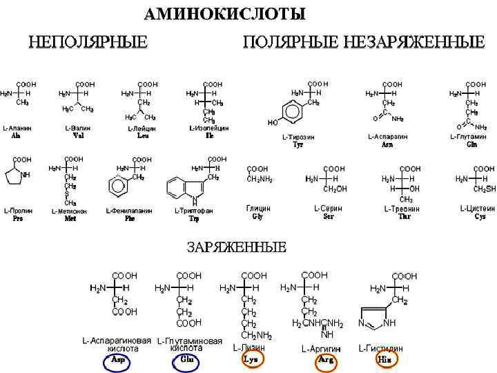 Приняты три классификации аминокислот: 1) структурная, т. е. по строению бокового радикала; 2) электрохимическая – по кислотно-основным свойствам аминокислот; 3) биологическая или физиологическая, т. е. по степени незаменимости для организма. Делят на незаменимые ( для человека восемь: валин, лейцин, изолейцин, треонин, лизин, метионин, фенилаланин, триптофан). Полузаменимые – (для человека три: аргинин, тирозин, гистидин).