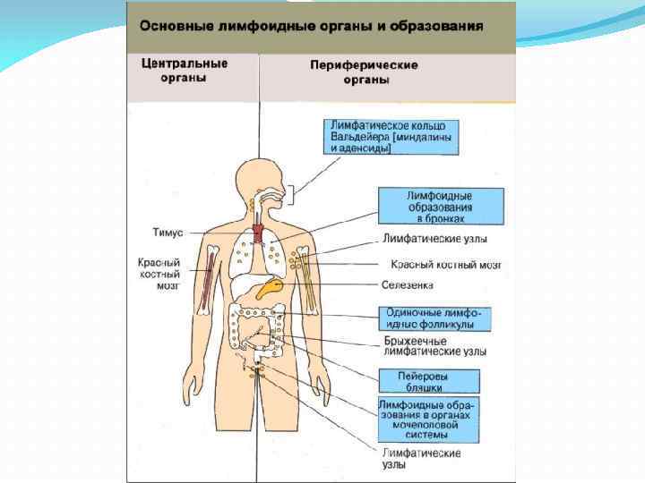 Например, у перенёсших ветрянку, корь, дифтерию людей часто возникает пожизненный иммунитет к этим заболеваниям. В случае аутоиммунных реакций антигеном может служить молекула, произведённая самим организмом. Органы иммунной системы Иммунная система обеспечивает иммунную защиту организма за счет клеточных элементов иммунной системы, которыми являются лимфоциты и плазмоциты. Иммунную систему составляют лимфатические узлы, селезенка, костный мозг, вилочковая железа, или тимус, а также лимфоидная ткань стенок дыхательной и пищеварительной систем, к которой относятся миндалины, групповые лимфоидные узелки червеобразного отростка, групповые и одиночные лимфоидные узелки подвздошной кишки.