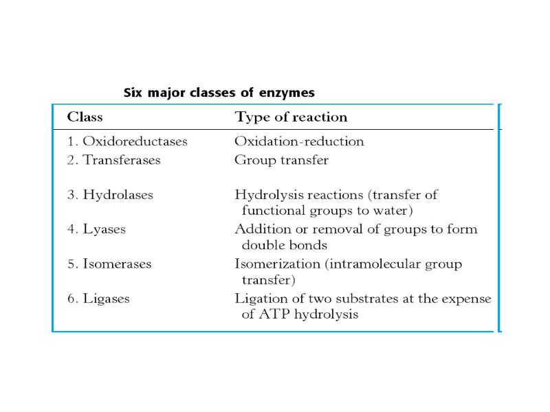 Классификация ферментов Оксиредуктазы (окислительно- восстановительные реакции) Трансферазы (перенос функциональных групп) Гидролазы (гидролиз с присоединением воды) Лиазы (добавление к двойным связям или удаление от них функциональных групп) Изомеразы (внутримолекулярный перенос групп) Лигазы (связывание двух субстратов с расходом энергии АТФ)