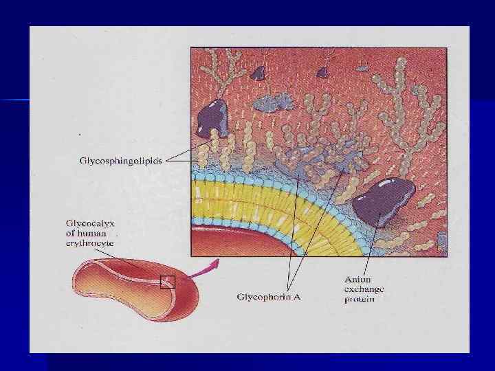 Мембрана Э: n 15 белков с М. м. от 15 до 250 к. Д, 60% массы составляют гликофорин, спектрин, белок полосы3 n Гликофорин –интегральный, только в Э, к –Nконцу около 20 олигосахаридных цепей, на поверхности – групповые вещества крови ( антигены) различаются природой концевых участков олигосахаридов, входящих в структуру гликолипидов. По системе АВО детерминантными углеводами являются: n альфа-фукоза для группы крови О, n альфа-N-ацетилгалактозамин для группы А, n галактоза для группы В.