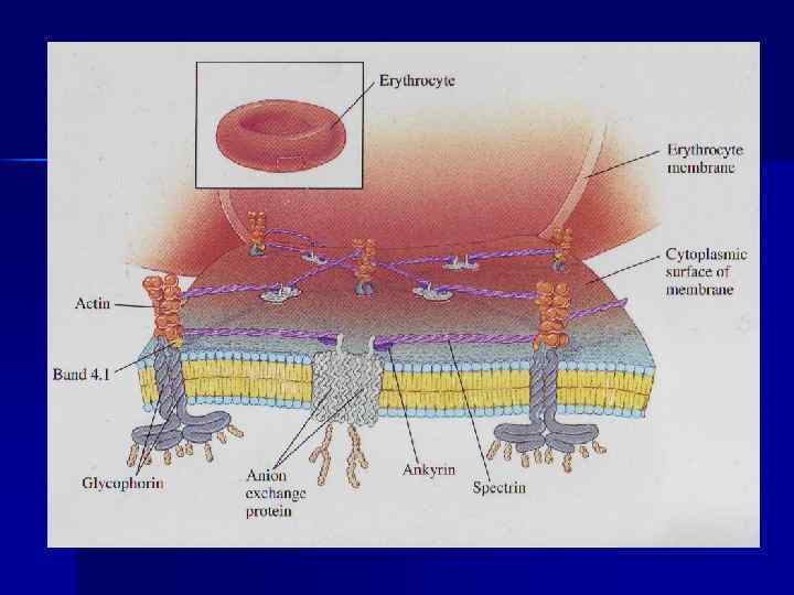 Спектрин- периферический, фибриллярный, доменный, содержит и антипараллельно расположенные цепи. С мембраной взаимодействие n 1) нековалентное, белок полосы 4. 1 образует со спектрином и актином «узловой комплекс» , который связан с цитоплазматическим доменом гликофорина n 2) -цепь спектрина + анкирин + цитоплазматический домен белка полосы 3 n Основной белок цитоскелета Э Белок полосы 3 – интегральный, переносчик ионов Cl-, HCO 3— по механизму пассивного антипорта. n