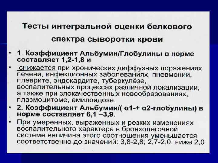 Белки плазмы крови Общий белок – 64 -83 г/л n Диагностическое значение определения (рефрактометрия, биуретовая реакция) общего белка: повышение свыше 90 г/л – гиперпротеинемия – результат гипериммуноглобулинемии либо поликлональной или моноклональной гаммапатии. n Псевдогиперпротеинемия; in vivo – при выраженной гипогидратации; in vitro – при высушивании пробы. .