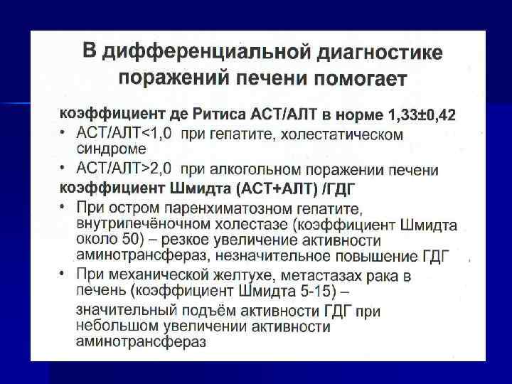 Факторы, определяющие скорость высвобождения ферментов из повреждённых тканей: Концентрационный градиент – ферменты с более высокими концентрационными градиентами быстрее уходят из клетки, чем энзимы с меньшими градиентами. ЛДГ – содержание в гепатоцитах в 3000 раз выше, чем вне клеток, а в эритроцитах –только в 200 раз. Отношение внутриклеточной активности к внеклеточной для ферментов печени: 50000: 1 –сорбитол. ДГ, 20000: 1 –алкоголь. ДГ, 10000: 1 для Ас. АТ и Ал. АТ. n Размер и мол. масса : более мелкие молекулы диффундируют с большими скоростями, чем крупные; с меньшей относительной мол. Массой высвобождаются на ранней стадии повреждения. n Внутриклеточная локализация ферментов: наиболее легко высвобождаются локализованные в цитозоле клетки Быстрое повреждение относительно небольшого числа клеток (вирусный гепатит) может приводить к очень значительному повышению уровней ферментов в крови, которое понижается по мере выздоровления. Наоборот, при развившемся циррозе степень поражения печени может быть значительно больше, но скорость активного повреждения клеток часто низкая и содержание ферментов в крови бывает лишь незначительно повышено или даже остаётся в пределах нормы. n