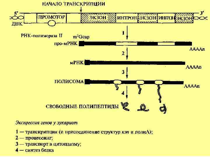Транскрипция у эукариот промотор экзон интрон экзон ДНК интрон терминатор транскрипция м. РНК КЭП экзон интрон процессинг Зрелая м. РНК КЭП экзон Поли А