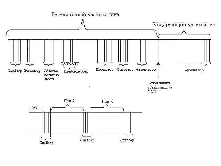 Регуляторная часть гена • Промотор – на 5’ конце (инициация транскрипции) • Спейсеры-некодирующие последовательности • Терминатор – на 3’ конце (терминация транскрипции)
