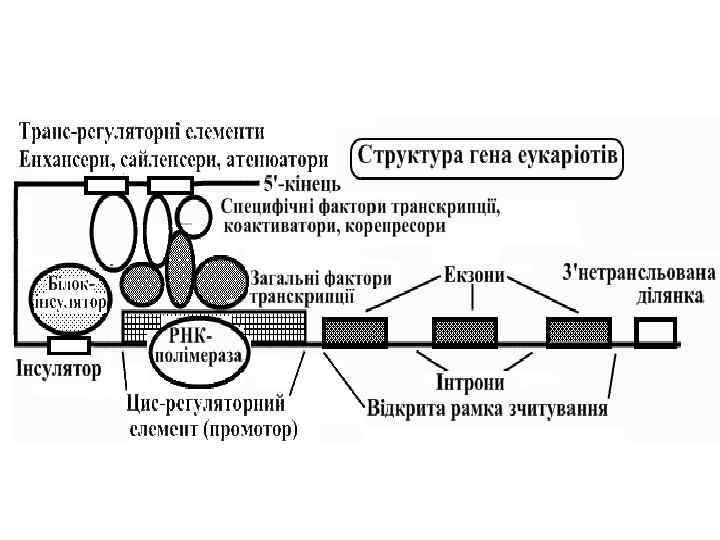 Гены эукариот • Регуляторные последовательности могут находиться как в непосредственной близости от открытой рамки считывания, кодирующей белок, или начала последовательности РНК, как в случае с промоторами (так называемые cisрегуляторные элементы), так и на расстоянии многих миллионов пар оснований (нуклеотидов), как в случае с энхансерами, инсуляторами и супрессорами (иногда классифицируемые как trans-регуляторные элементы).