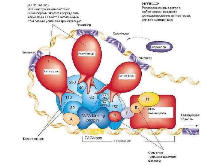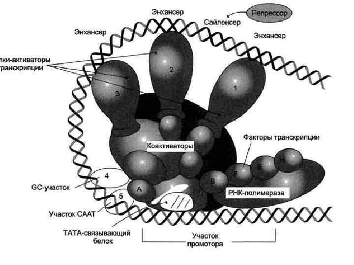 • Оператор - сайт связи с белкомрепрессором • Энхансеры - усиливают скорость транскрипции • Сайленсеры - снижают скорость транскрипции • Аттенуаторы - запускают или останавливают транскрипцию