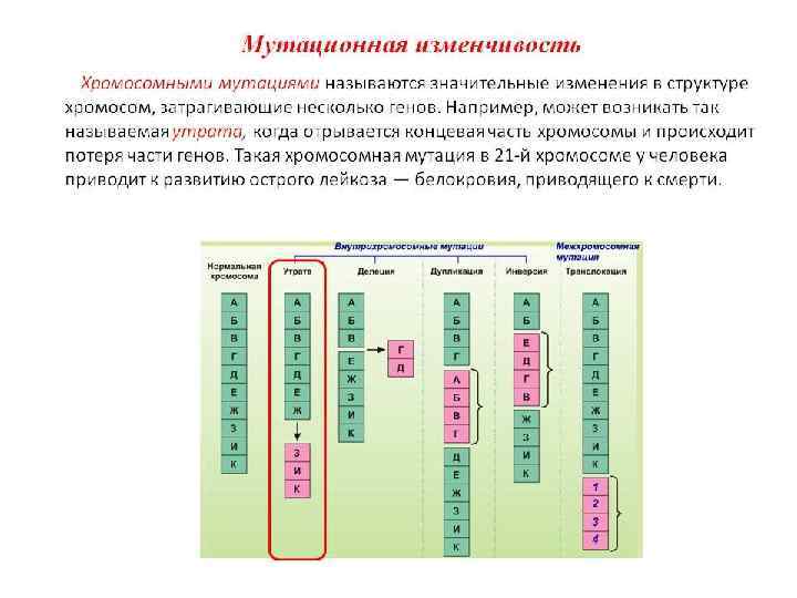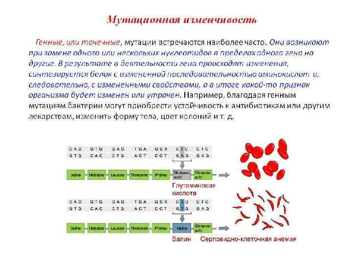 • Гены могут подвергаться мутациям — случайным или целенаправленным изменениям последовательности нуклеотидов в цепи ДНК. • Мутации могут приводить к изменению последовательности, а следовательно изменению биологических характеристик белка или РНК, которые, в свою очередь, могут иметь результатом общее или локальное изменённое или анормальное функционирование организма.