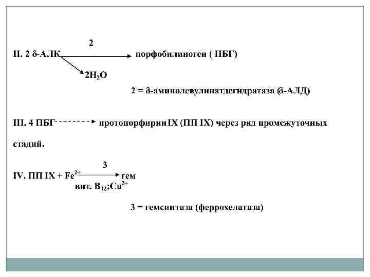 Наследственные или приобретенные нарушения синтеза гема – порфирии. Для них характерно: • выделение предшественников гема – порфиринов с калом или мочой (темно-красный цвет). • Порфирины откладываются в коже, и при воздействии света это приводит к образованию трудноизлечимых волдырей. • Часты нервно-психические расстройства.
