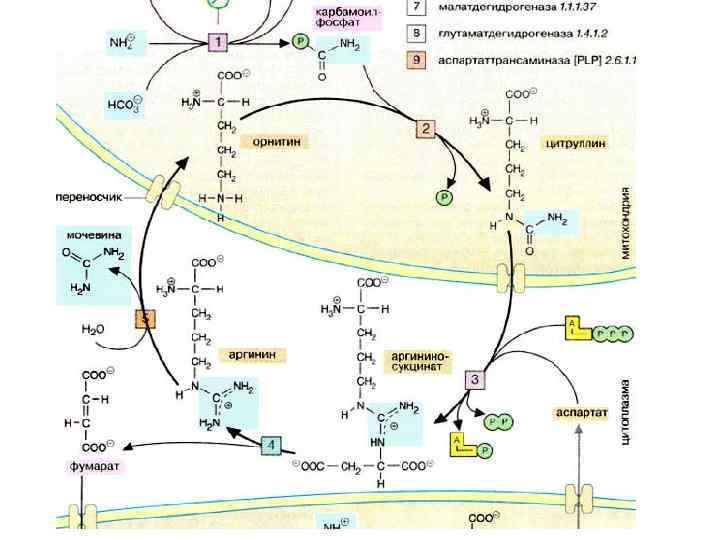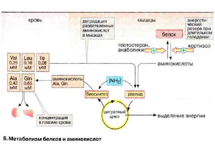 Метаболизм аминокислот и белков. Уровень аминокислот в плазме крови регулируется печенью. Избыточные аминокислоты расщепляются, аммиак связывается в цикле мочевины (см. с. 184), мочевина переносится в почки. Углеродный скелет аминокислот включается в промежуточный метаболизм как источник для синтеза глюкозы (глюконеогенез) или как источник энергии. Кроме того, в печени осуществляется синтез и расщепление многих белков плазмы крови.
