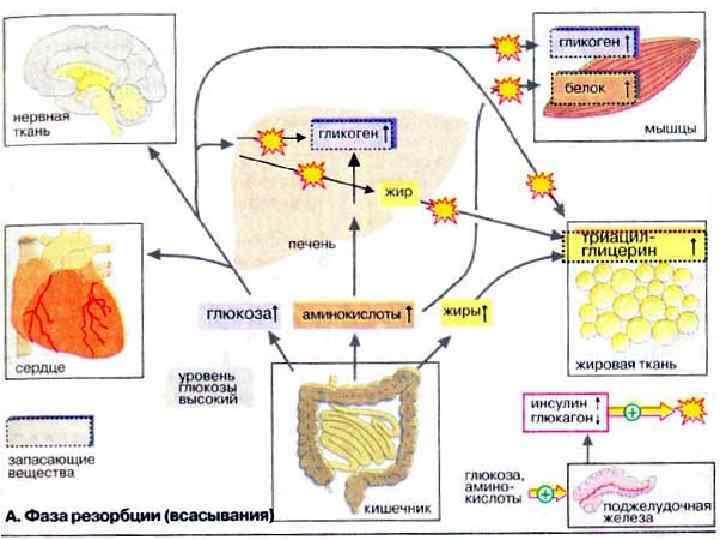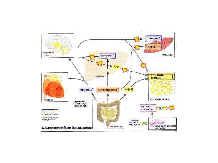 Фаза резорбции (всасывания) начинается непосредственно с приемом пищи и длится примерно 2 -4 ч. За счет переваривания пищи в плазме крови временно увеличивается концентрация глюкозы, аминокислот и жиров (триглицеринов). Поджелудочная железа отвечает на это изменением выброса гормонов: увеличением секреции инсулина и уменьшением секреции глюкагона. Увеличение соотношения инсулин/гпюкагон в сочетании с богатыми энергией субстратами стимулирует переход тканей (особенно печени, мышечной и жировой тканей) в анаболическую фазу. В печени из поступающих субстратов синтезируются гликоген и жиры. Гликоген депонируется в печени, жиры в виде липопротеинов очень низкой плотности [ЛОНП (VLDL)] поступают в кровь.