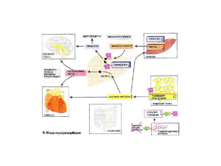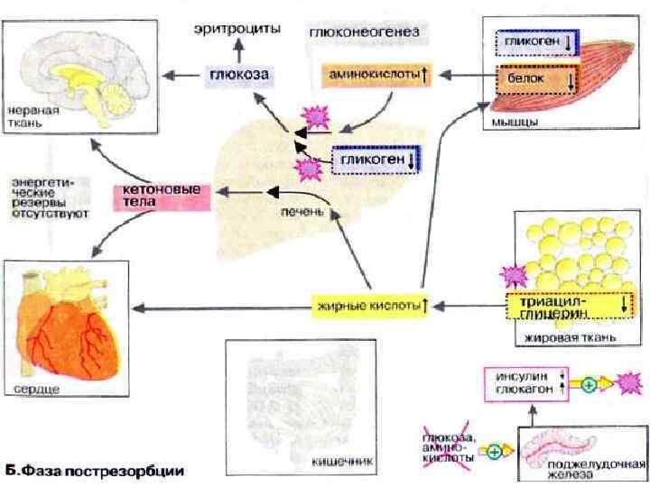 В печени происходит мобилизация гликогена (гликогенолиз, см. с. 158), Полученная глюкоза используется для обеспечения других тканей, прежде всего мозга, коры надпочечников и эритроцитов, не располагающих собственными резервами глюкозы. Если спустя несколько часов резервы глюкозы в печени окажутся исчерпанными, усиливается процесс глюконеогенеза (см. с. 156). Субстраты поступают из мышц (аминокислоты) и жировой ткани (глицерин). Высвободившиеся жирные кислоты используются печенью для синтеза кетоновых тел (кетогенез, см. с. 304), которые направляются в кровь и служат важнейшим источником энергии в пострезорбционной фазе. В мышцах разнообразные резервы глюкозы используются исключительно для собственных нужд (см. с. 238). Аминокислоты, образующиеся за счет медленного расщепления белков, поступают в печень и утилизируются в процессе глюконеогенеза.