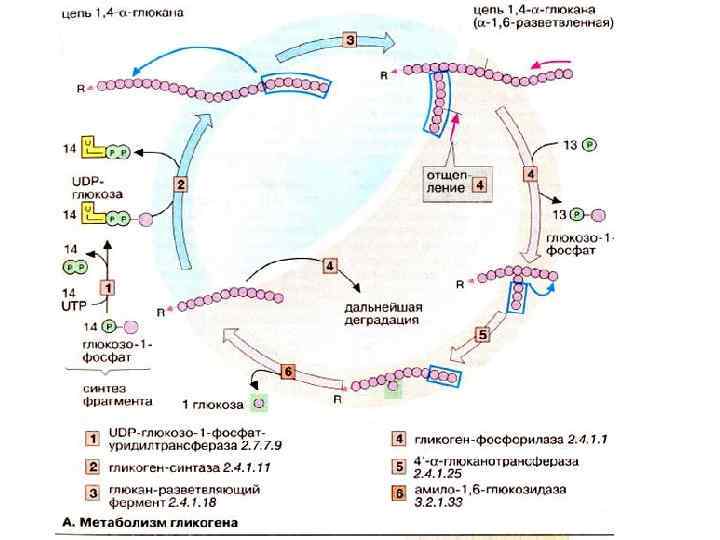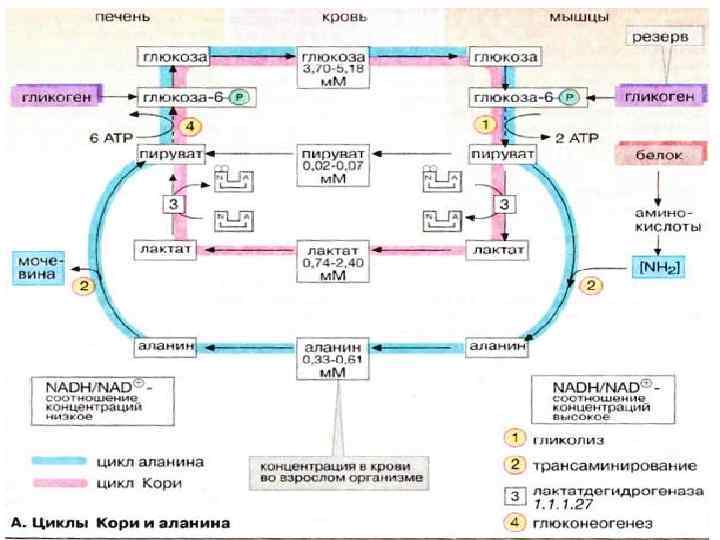 Печень обладает свойством синтезировать глюкозу из других сахаров, например фруктозы и галактозы, или из других продуктов промежуточного метаболизма. Превращение лактата в глюкозу в цикле Кори (см. с. 330) и аланина в глюкозу в цикле аланина (см. с. 330) играет особую роль в обеспечении эритроцитов и мышечных клеток. Необходимыми условиями активного углеводного обмена в печени является обратимый транспорт сахаров через плазматическую мембрану гепатоцитов (при отсутствии контроля инсулином) и наличие фермента глюкозо-6 фосфатазы, высвобождающего глюкозу из глюкозо-6 фосфата.