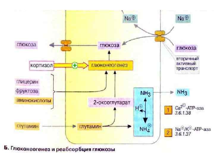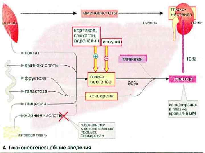 Глюконеогенез: общие сведения Синтез глюкозы de novo (до 250 г в сутки) происходит в основном в печени. Процесс глюконеогенеза может идти и в почках, однако из-за небольших размеров почек их вклад в синтез глюкозы составляет всего 10%. Глюконеогенез контролируется гормонами. Кортизол, глюкагон и адреналин стимулируют этот процесс, а инсулин, напротив, подавляет. При глюконеогенезе в печени наиболее важными субстратами являются лактат, поступающий из мышечной ткани и эритроцитов, аминокислоты из желудочно-кишечного тракта (глюкогенные аминокислоты) и мышц (аланин), а также глицерин из жировых тканей. В почках в качестве субстрата служат главным образом аминокислоты (см. с. 320).