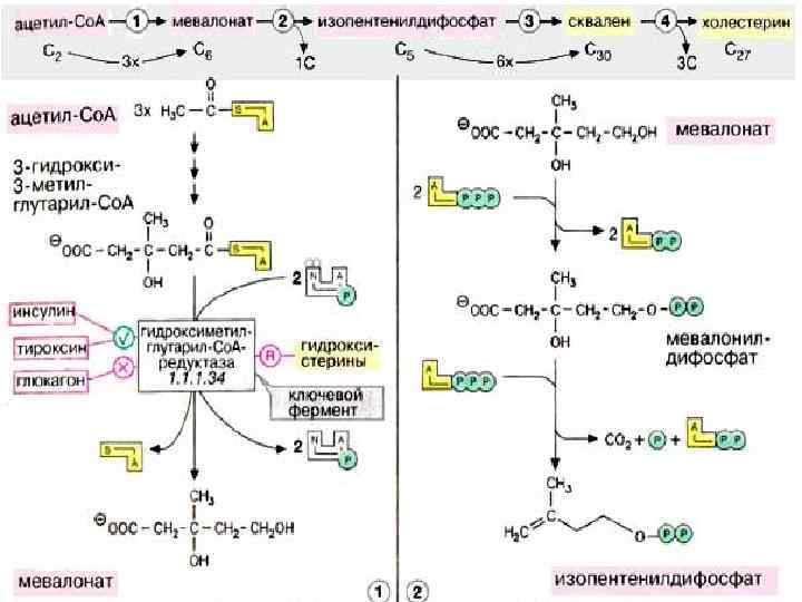 В печени идет синтез холестерина из ацетатных блоков. Затем холестерин в составе липопротеинов транспортируется в другие органы. Избыток холестерина превращается в желчные кислоты или выводится из организма с желчью.