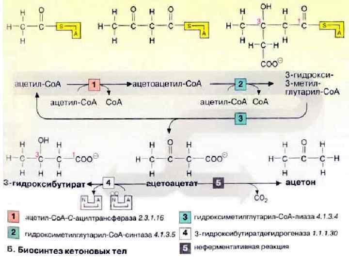 Биосинтез кетоновых тел При высокой концентрации ацетил-Ко. А в митохондриях гепатоцитов происходит конденсация двух молекул ацетил-Ко. А с образованием ацетоацетил-Ко. А [1]. Присоединение еще одной ацетильной группы [2] приводит к 3 -гидрокси-З-метилглутарил-Ко. А (ГМГ-Ко. А) [3], который после отщепления ацетил-Ко. А превращается в ацетоуксусную кислоту (ацетоацетат) (цикл Линена). При восстановлении последней получается 3 -гидроксибутират [4], а при неферментативном декарбоксилировании — ацетон [5]. Все три соединения принято называть «кетоновыми телами» , что не совсем правильно, поскольку в 3 -гидроксимасляной кислоте отсутствует кетогруппа!