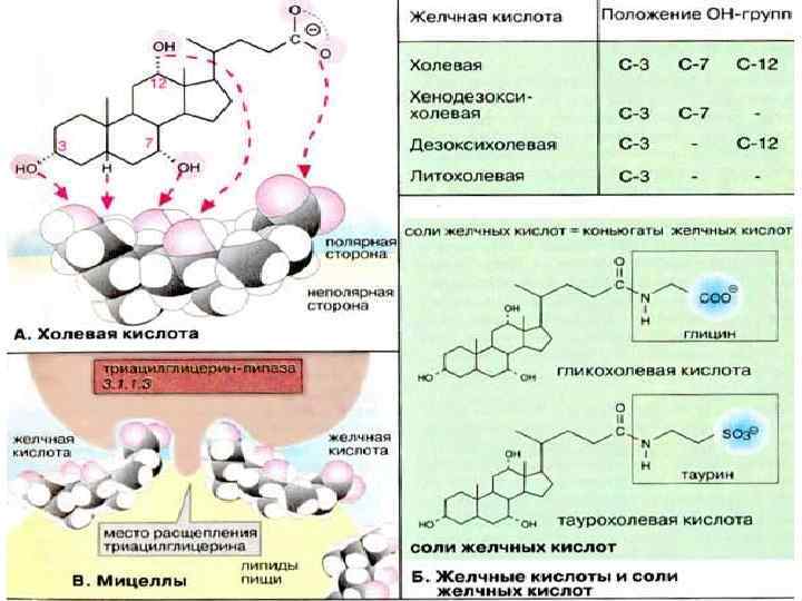 Мицеллы В связи с наличием в структуре α-гидроксильных групп желчные кислоты и соли желчных кислот являются амфифильными соединениями и обладают свойствами детергентов (см. с. 34). Основные функции желчных кислот состоят в образовании мицелл, эмульгировании жиров и солюбилизации липидов в кишечнике. Это повышает эффективность действия панкреатической липазы и способствует всасыванию липидов (см. с. 264). На рисунке показано, как молекулы желчных кислот фиксируются на мицелле своими неполярными частями, обеспечивая ее растворимость. Липаза агрегирует с желчными кислотами и гидролизует жиры (триацилглицерины), содержащиеся в жировой капле.