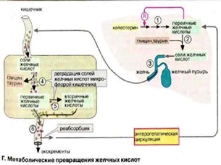 Метаболические превращения желчных кислот Первичные желчные кислоты образуются исключительно в цитоплазме клеток печени. Процесс биосинтеза (1) начинается с гидроксилирования холестерина по С-7 и С-12, и эпимеризации по C -3, затем следует восстановление двойной связи в кольце В (см. рис. 63) и укорачивание боковой цепи на три углеродных атома. Лимитирующей стадией является гидроксилирование по С-7 с участием 7α-гидроксилазы. Холевая кислота служит ингибитором реакции, поэтому желчные кислоты регулируют скорость деградации холестерина. Коньюгирование желчных кислот проходит в две стадии. Вначале образуются Ко. А-эфиры желчных кислот, а затем следует собственно стадия конъюгации с глицином или таурином (2) с образованием, например, гликохолевой и таурохолевой кислот. Желчь дренируется во внутрипеченочные желчные протоки и накапливается в желчном пузыре (3).
