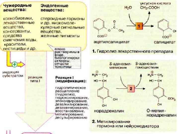 К наиболее важным реакциям типа I относятся следующие: —гидролитическое расщепление (гидролиз) эфиров и пептидов, в качестве примера на схеме приводится гидролиз болеутоляющего средства, ацетилсалициловой кислоты (1); —реакции окисления: гидроксилирование, введение эпоксидной группы, образование сульфоксидов, дезалкилирование, дезаминирование; —реакции восстановления: восстановление нитросоединений, дегалогенирование; —метилирование: в качестве норадреналина (2) (см. с. 342); примера карбонильной приводится группы, инактивация азо- или катехоламина —десульфирование. Реакции протекают в гепатоцитах на гладком эндоплазматическом ретикулуме. Реакции окисления катализируются системой цитохрома Р 450 (см. с. 310). Эта система "индуцибельна", т. е. ее активность возрастает в присутствии субстратов, после чего она может осуществлять метаболическую трансформацию различных субстратов. Исключение составляют субстратспецифичные ферменты стероидного обмена (см. с. 364).
