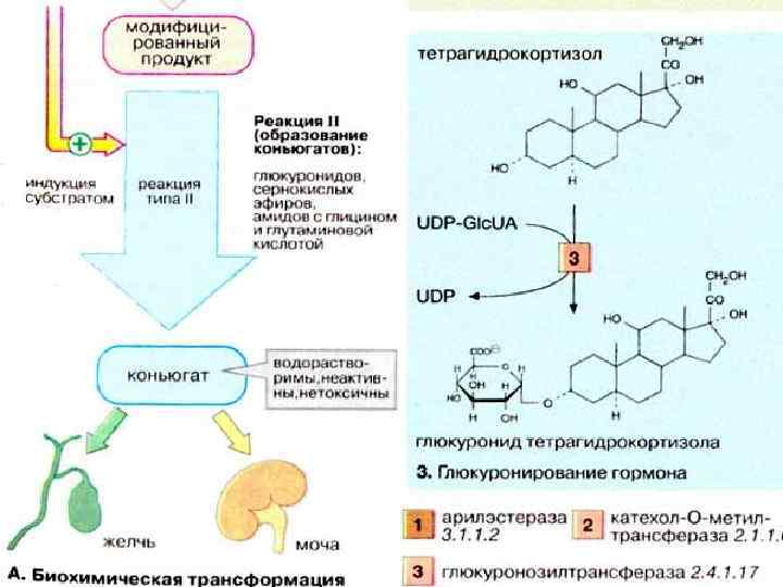 Биохимическая трансформация. Стероидные гормоны и билирубин, а также лекарственные вещества, этанол и другие ксенобиотики поступают в печень, где они инактивируются и конвертируются в высоко полярные соединения.