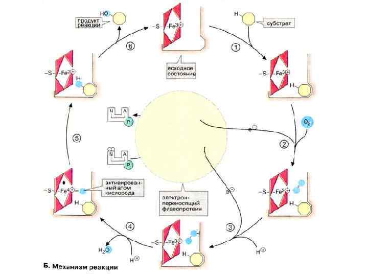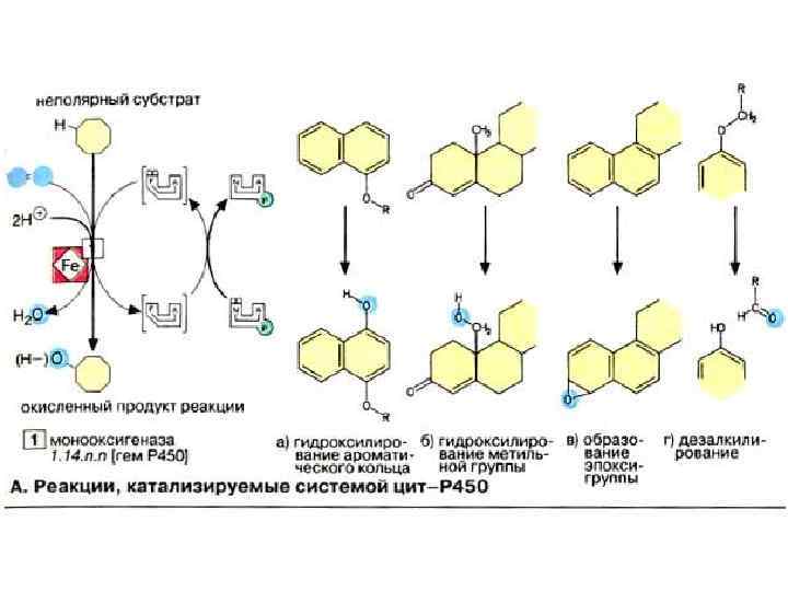 Реакции, катализируемые системой цит. Р 450 Цит. Р 450 -зависимые монооксигеназы катализируют расщепление веществ разного типа с участием НАДФН и молекулярного кислорода (О 2). При этом один атом кислорода присоединяется к субстрату, а второй освобождается в составе молекулы воды. В реакции принимает участие флавопротеин, выполняющий функцию переносчика восстановительного эквивалента с кофермента НАДФН + Н+ на собственно монооксигеназу, которая переносит электроны на молекулярный кислород.