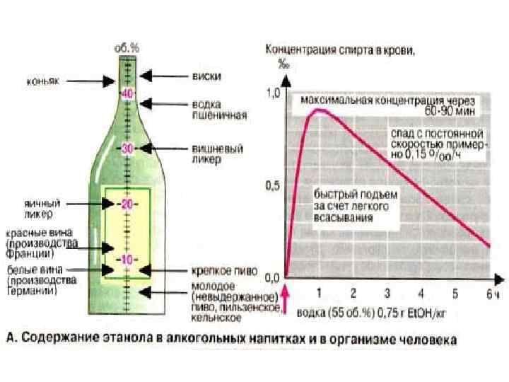 Содержание этанола в алкогольных напитках и в организме человека Следы этанола (Et. OH, этиловый спирт) можно обнаружить во фруктах. В алкогольных напитках этанол присутствует в существенно более высоких концентрациях. Содержание этанола принято указывать в объемных процентах. Нормы потребления этанола и концентрацию в крови целесообразно давать в граммах (плотность этанола 0, 79 кг/л). Например, в одной бутылке пива (0, 5 л, 4% Et. OH) содержится 20 мл = 16 г этанола, в одной бутылке вина (0, 7 л, 12% Et. OH) — 84 мл = 66 г этанола.