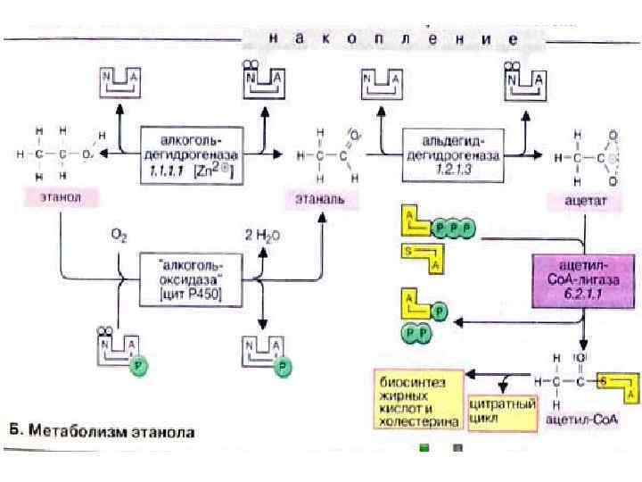 Метаболизм этанола Основным местом метаболической трансформации этанола является печень, в этом процессе может также принимать участие эпителий желудка. Этанол дегидрируется алкогольдегидрогеназой в этаналь (ацетальдегид), а затем альдегидрогеназой переводится в ацетат. Уксусная кислота в реакции, катализируемой ацетат-Ко. А-лигазой (тиокиназой) в присутствии АТФ, превращается в ацетил-Ко. А (ацетил. Со. А). Следует отметить, что весь процесс промежуточного метаболизма хорошо согласован. Наряду с цитоплазматической алкогольдегидрогеназой в метаболизме этанола принимают ограниченное участие каталаза и "индуцибельная" микросомальная алкогольоксидаза