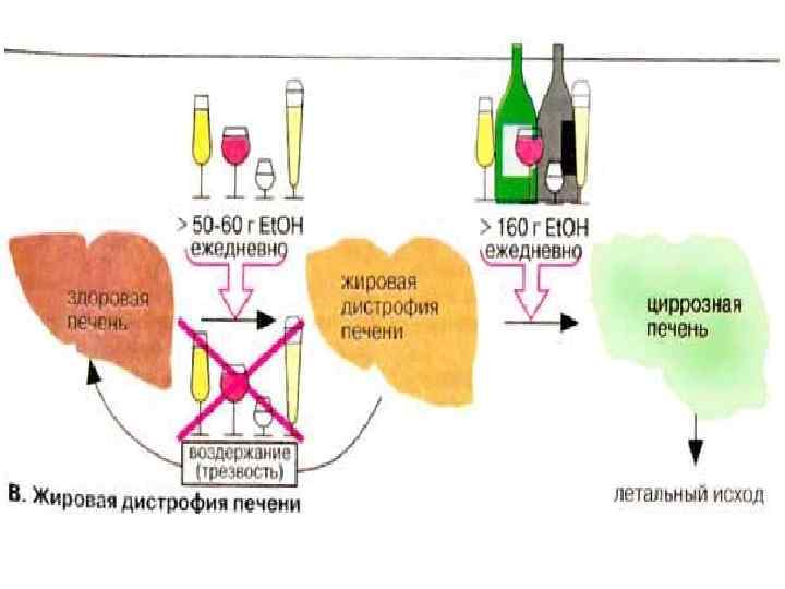 Жировая дистрофия печени Предельная норма этанола для здорового человека при ежедневном приеме составляет 60 г для мужчин и 50 г для женщин. Эта величина зависит от массы, состояния здоровья, а также от приема лекарственных препаратов. Повышенное потребление этанола в течение года вызывает заболевание печени. Из-за высокого уровня НАДН и ацетил-Ко. А, вызванных приемом этанола, в печени тормозится цитратный цикл и кетогенез, нарушается биосинтез нейтральных жиров и холестерина, наблюдается повышенное отложение жира (жировая дистрофия). Отложение жира (от 5 до 50% по сухой массе) чаще всего процесс обратимый. При гибели гепатоцитов из-за хронического алкоголизма наступает фиброз печени (избыточное развитие соединительной ткани). При циррозе печени заболевание переходит в необратимую форму, для которой характерно прогрессирующее отключение функций печени.