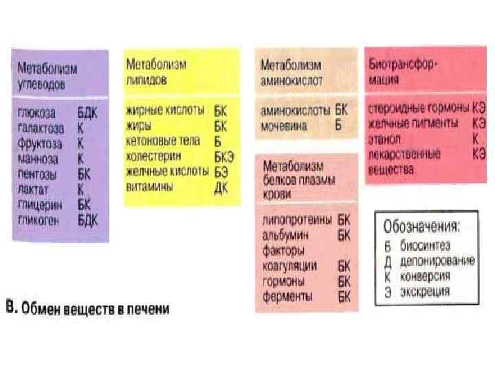 Функции печени метаболическая, депонирующая, барьерная, экскреторная и гомеостатическая.