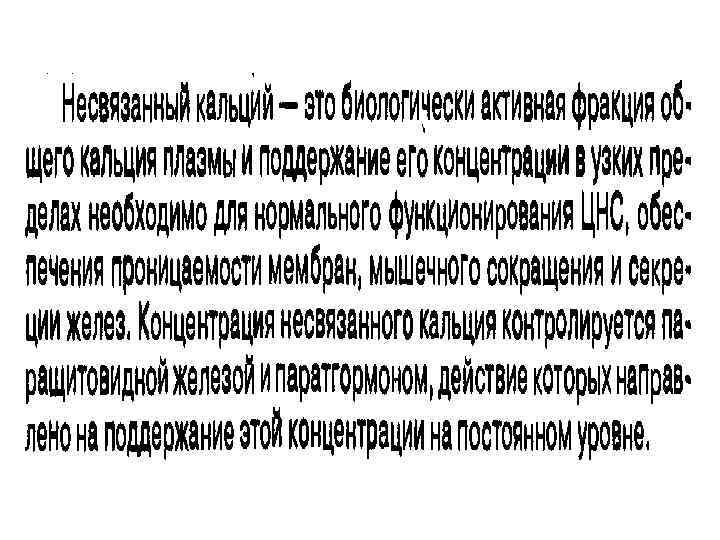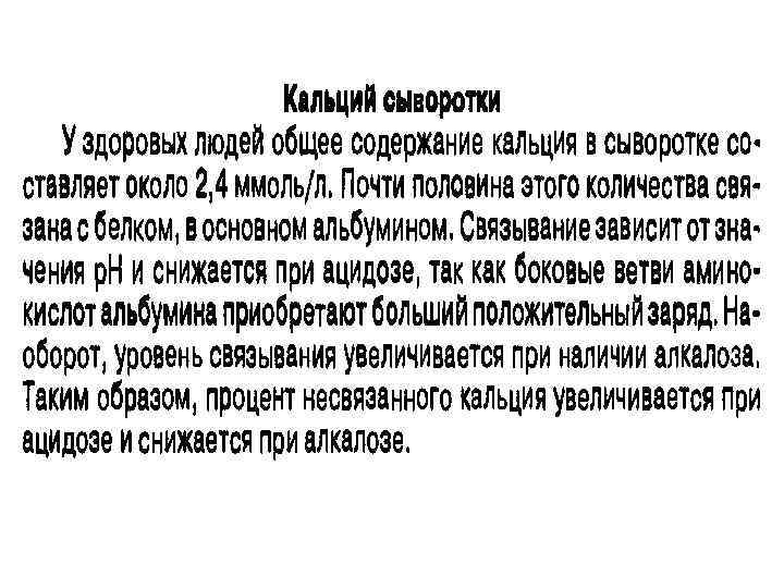 Биохимические маркеры резорбции и образования кости Кальций общий (Ca, Calcium total) Основной компонент костной ткани и важнейший биогенный элемент, обладающий важными структурными, метаболическими и регуляторными функциями в организме. 99% кальция содержится в костной ткани (зубы, кости скелета). В костях кальций содержится в виде гидроксиапатитов - кристаллов, в составе которых кроме кальция присутствуют фосфаты. Лишь около 1% Са содержится в сыворотке и других биологических жидкостях организма. В крови кальций содержится в трёх формах: 1) ионизированного (свободного) кальция, который физиологически активен; 2) кальция комплексированного с анионами - лактатом, фосфатом, бикарбонатом, цитратом; 3) кальция, связанного с белками - преимущественно альбумином.