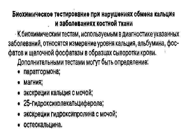 Повышение уровня остеокальцина: 1. постменопаузальный остеопороз; 2. остеомаляция; 3. первичный и вторичный 4. гиперпаратиреоз; 5. болезнь Педжета; 6. почечная остеодистрофия; 7. опухоли, метастазы в кости; 8. диффузный токсический зоб; 9. быстрый рост у подростков; 10. хроническая почечная недостаточность.