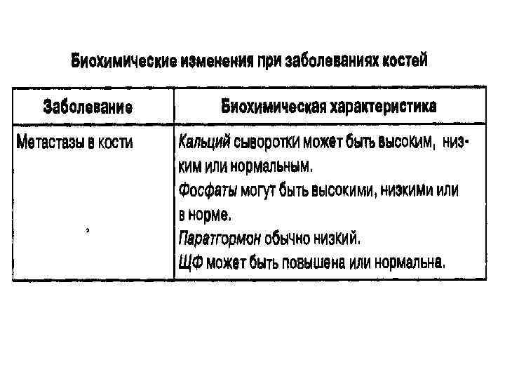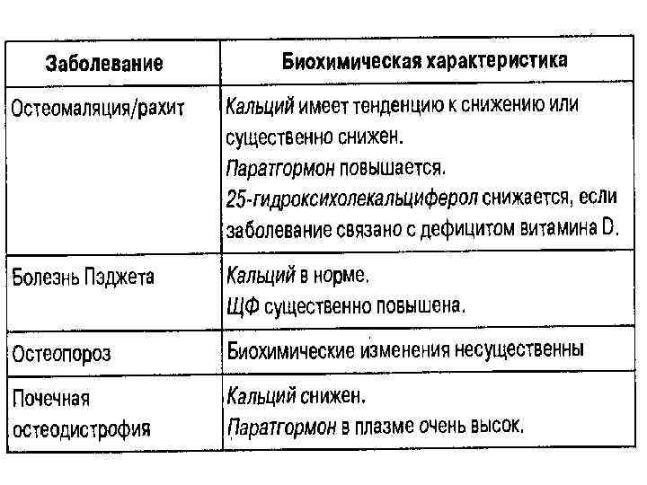 Заболевания костей Обнаружение у пациентов гипер- или гипокальцемии не свидетельствует об обязательном наличии у них изменений в костной ткани. Вместе с тем, тяжелые заболевания костей могут наблюдаться и при нормальном уровне кальция в сыворотке крови. К наиболее частым заболеваниям костей относят: 1. Остеопороз 2. Остеомаляция и рахит 3. Болезнь Пэджета