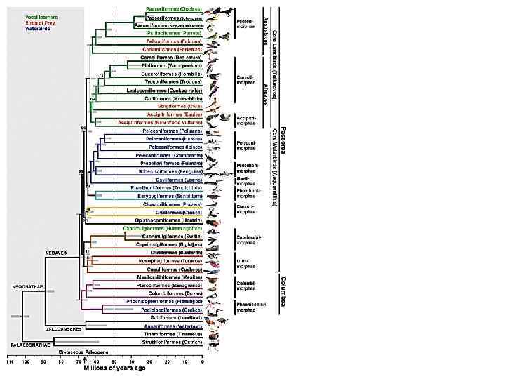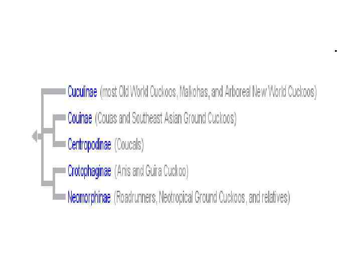 Отр. Cuculiformes Кукушкообразные Подотр. Musophagi Тураковые или бананоеды Сем. Musophagidae Тураковые Подотр. Cuculi Кукушковые Сем. Cuculidae. Кукушковые