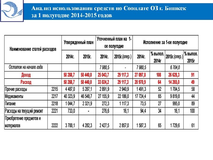 Исполнение за 1 полугодие 2014 -2015 годов по Бюджетным средствам ОЗ г. Бишкек