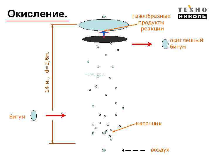 Окисление. газообразные продукты реакции 14 м. , d=2, 6 м. окисленный битум ~190 гр. С битум маточник воздух
