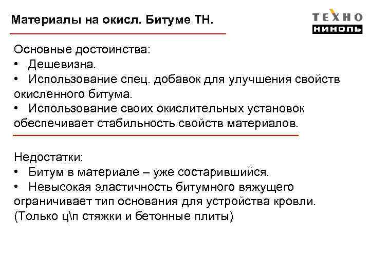 Материалы на окисл. Битуме ТН. Основные достоинства: • Дешевизна. • Использование спец. добавок для улучшения свойств окисленного битума. • Использование своих окислительных установок обеспечивает стабильность свойств материалов. Недостатки: • Битум в материале – уже состарившийся. • Невысокая эластичность битумного вяжущего ограничивает тип основания для устройства кровли. (Только цп стяжки и бетонные плиты)