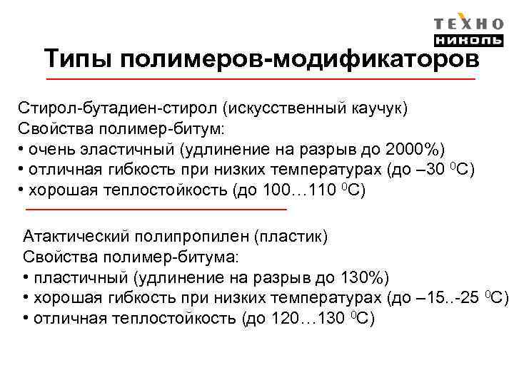 Типы полимеров-модификаторов Стирол-бутадиен-стирол (искусственный каучук) Свойства полимер-битум: • очень эластичный (удлинение на разрыв до 2000%) • отличная гибкость при низких температурах (до – 30 0 С) • хорошая теплостойкость (до 100… 110 0 С) Атактический полипропилен (пластик) Свойства полимер-битума: • пластичный (удлинение на разрыв до 130%) • хорошая гибкость при низких температурах (до – 15. . -25 0 С) • отличная теплостойкость (до 120… 130 0 С)