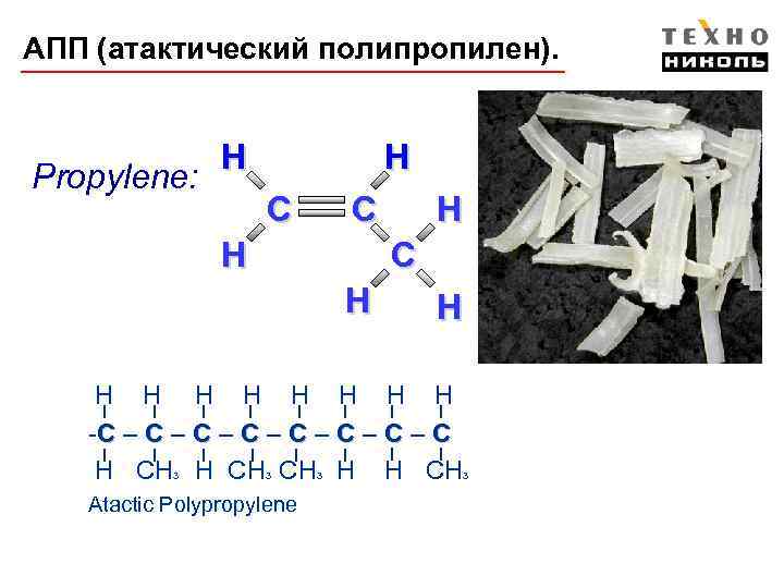 АПП (атактический полипропилен). Propylene: H H C C H H Н Н Н Н -С – С – С Н СН СН Н Н СН 3 3 Atactic Polypropylene 3 3