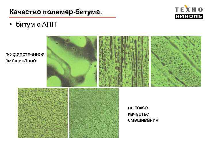 Качество полимер-битума. • битум с АПП посредственное смешивание высокое качество смешивания