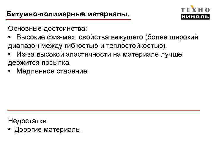 Битумно-полимерные материалы. Основные достоинства: • Высокие физ-мех. свойства вяжущего (более широкий диапазон между гибкостью и теплостойкостью). • Из-за высокой эластичности на материале лучше держится посыпка. • Медленное старение. Недостатки: • Дорогие материалы.