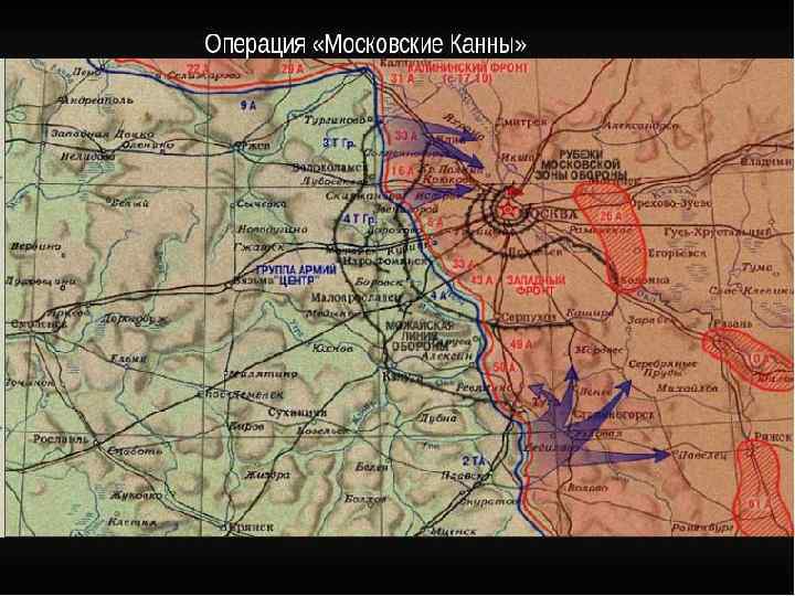 • Орловско-Брянская, Вяземская, Можайско-Малоярославецкая, • Калининская, • Тульская, • Клинско-Солнечногорская и • Наро-Фоминская. В ходе Битвы за Москову советскими войсками были проведены пять фронтовых оборонительных операций